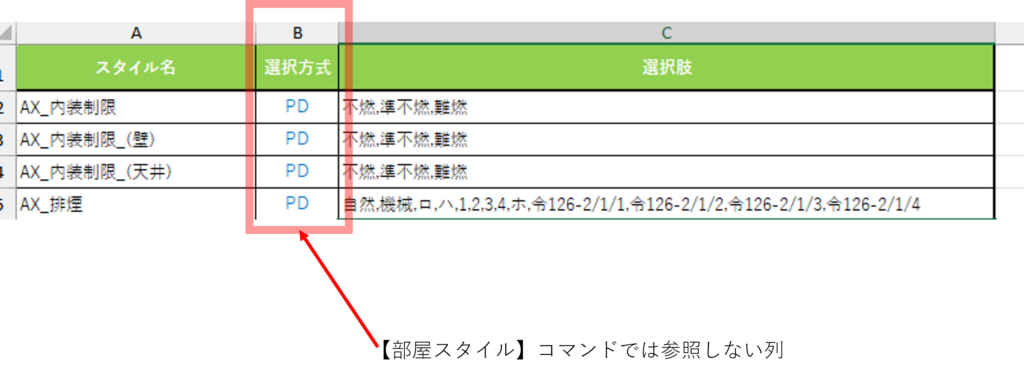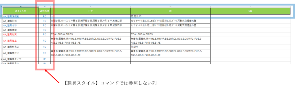 A列にスタイル名、B列に選択方式、C列にドア、D列に窓、E列にCWのセルを作成します。スタイル名の項目に合う内容を入力します。